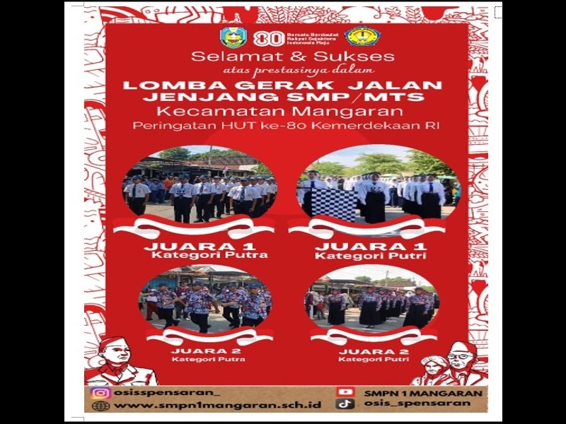 Pada pengumuman lomba tepatnya tanggal 26 Agustus 2025 pukul 19.30 bertempat di Kantor Kecamatan Mangaran, SMP Negeri 1 Mangaran berhasil menjadi juara 1 dan 2 Putra, Juara 1 dan 2 Putri.